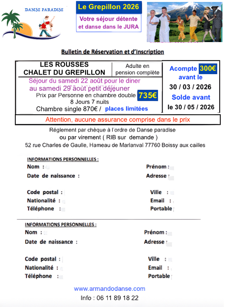 - Cours + 7 soirées dansantes incluses